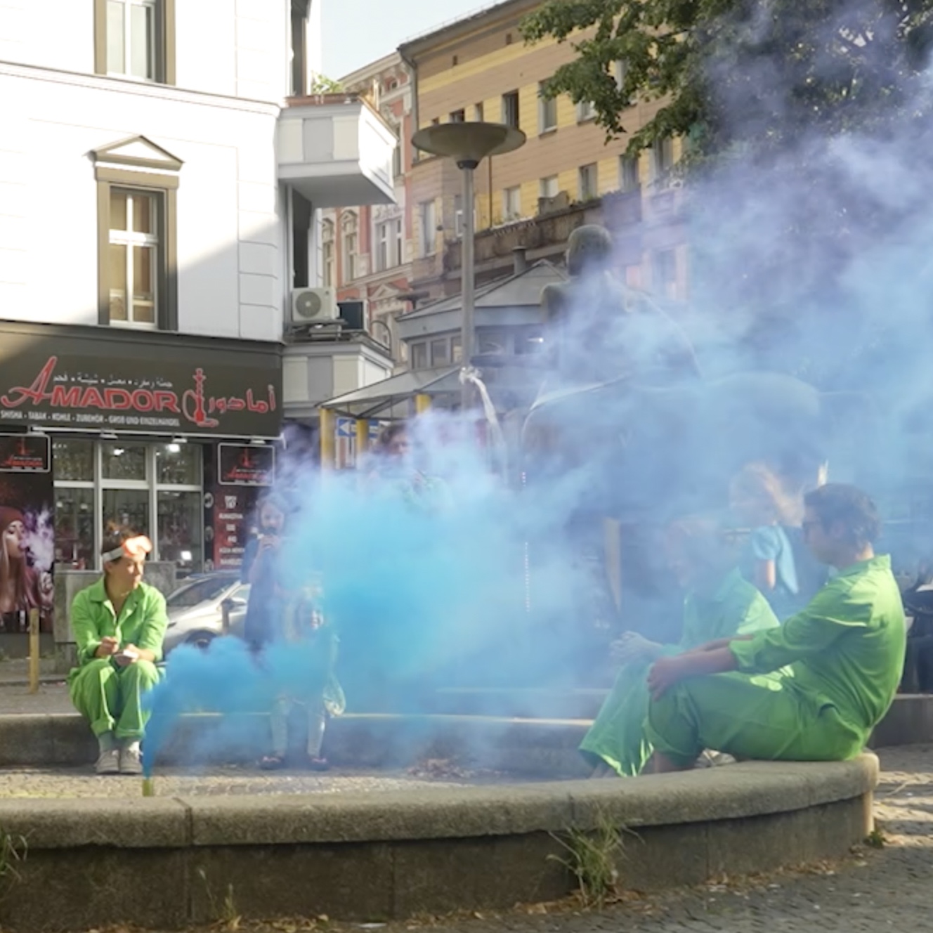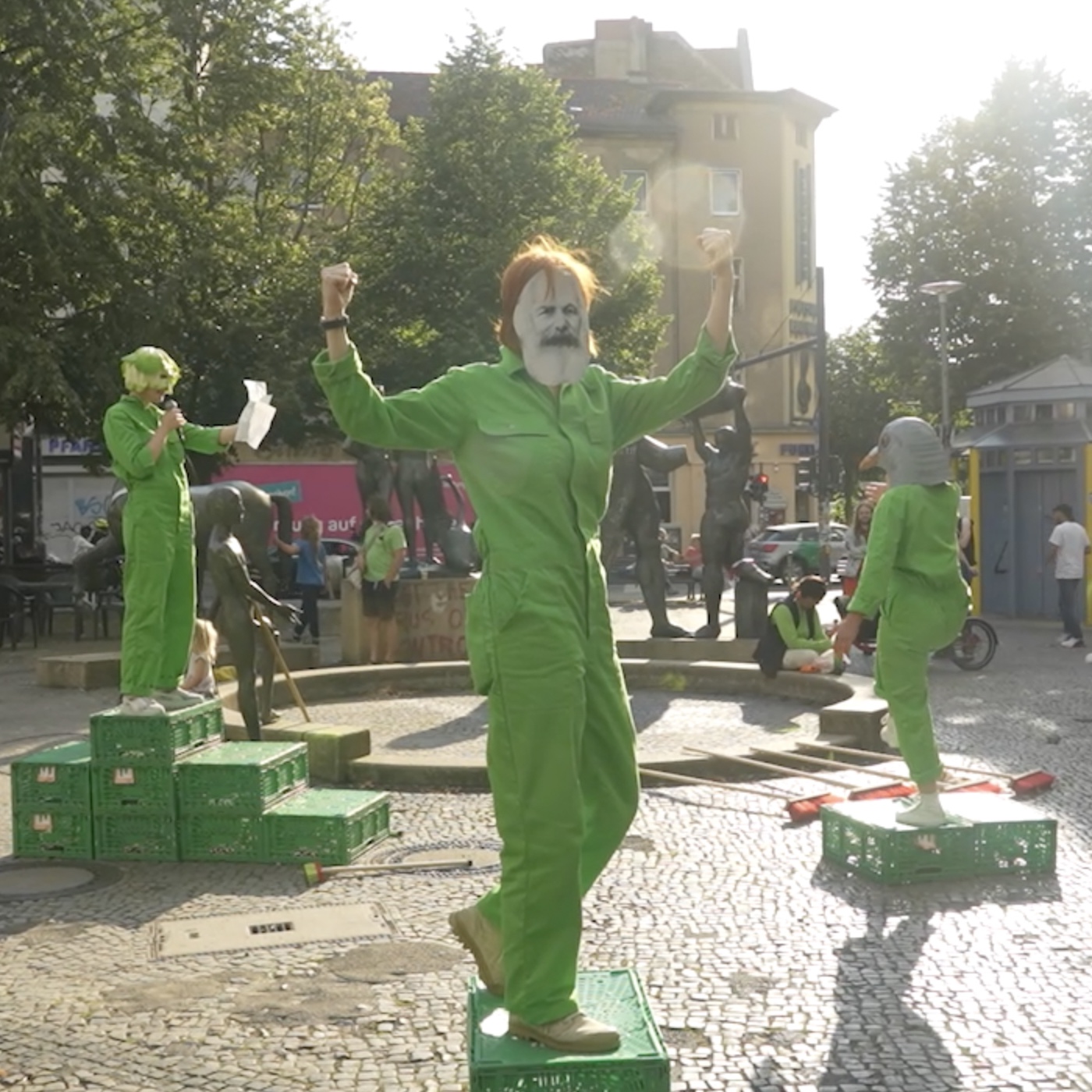 Umringt von Narziss, Leda, Schwan, Venus, Zentaur und den Titanen suchen wir am Karl-Marx-Platz nach Spiegelbildern, nach Geschichten, widersprüchlichen, unerwarteten. Nach Fragmenten von dem, was Platz und still gelegter Brunnen für die bedeuten, die hier wohnen, arbeiten, vorbeigehen, bleiben. Das Performancekollektiv Sportverein (Nelli David, Marie Hahne, Janine Hönig, Anna Stern) schärft die Sinne für das Übersehene im Bekannten. Unser Forschungsinstrument ist der eigene Körper im urbanen Raum. Unsere Methode ist das Spiel. Der Körper versteckt sich, erkundet Zwischenräume, verwandelt sich Dingen und Strukturen an, befragt sie, behauptet sich. Das Spiel ist an jedem Ort möglich, immer anders und lädt ein zur spontanen Teilnahme. Aus dem Spiel entstehen Performances, deren Form zwischen Improvisation und Skript oszilliert.